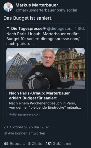 Wenn der Marterbauer nach der Hälfte der Legislaturperiode die SPÖ übernimmt, hätten die bei der nächsten Wahl eventuell sogar eine Chance auf ein kleines Plus. Aber so kaputt wie die sind wird das wohl nichts…